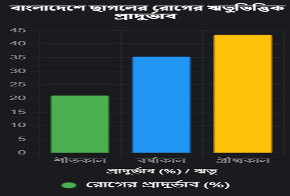 রোগের প্রকোপ ঋতুভেদে পরিবর্তিত হয়। বর্ষাকালে রোগের ঘটনা সবচেয়ে বেশি (৪৯.৬%), এরপর শীতকালে (৩০.৪%) এবং শুষ্ক মৌসুমে (১৯.৬%) । বর্ষাকালে প্রাপ্তবয়স্ক ছাগলের মৃত্যুর হার (২২.২২%) এবং বাচ্চার মৃত্যুর হার (২৫.৯৩%) সর্বোচ্চ হয় ।